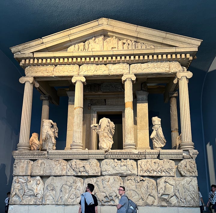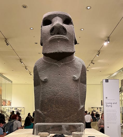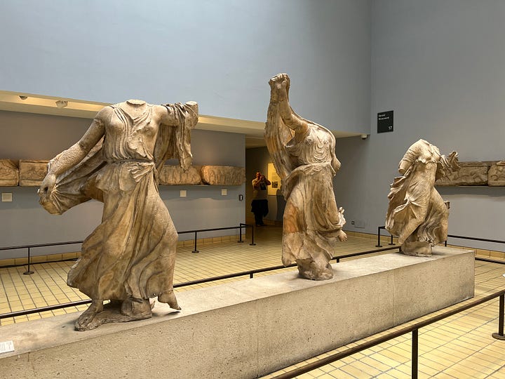 Greg: There's also all the different exhibits, multiple stories. There's an Easter Island statue. Very cool. There were African costumes that were very reminiscent to us of, like, Mardi Gras costumes that we saw growing up. There's an entire tomb they took from Western Turkey. It's the tomb from Halicarnassas, which they rebuilt in the museum. And it was all just terrific pieces of history and art. There's also Parthenon statues and reliefs. So…very, very cool.