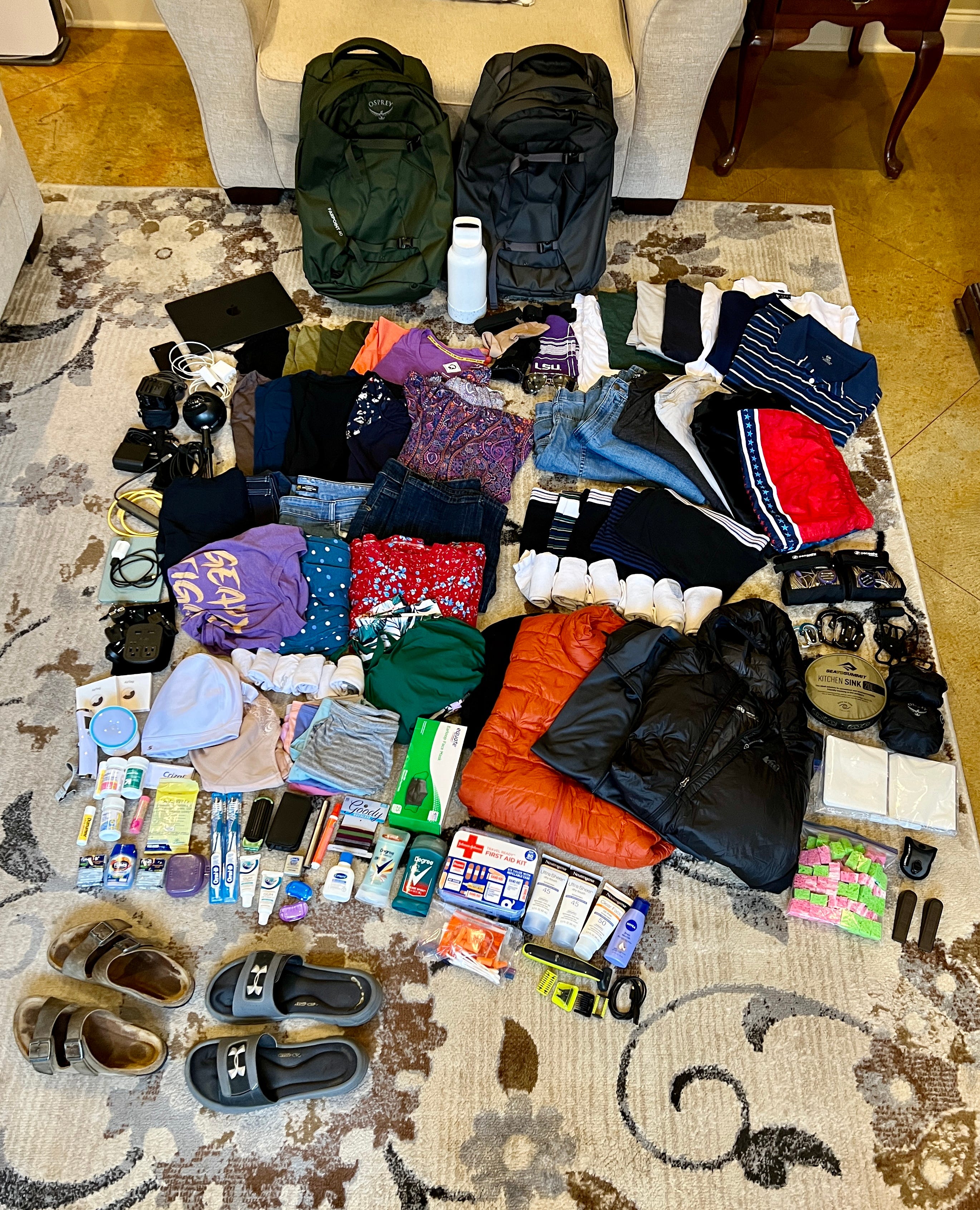 One thing that all of the articles stressed was to make sure that you have layers. In addition to the above list, we also bought down jackets from REI. They are very compressible and pack easily at the bottom of the backpack. Plus we got a great deal on them…since you don’t really need down jackets in Texas. Another recommendation is to not wear clothing with sports’ team logos, superhero emblems, and the like because this can mark you as a tourist making you a possible target for scams. This has been one of the hardest parts of packing because so much of what we wear are those things. I admittedly snuck one LSU shirt into my bag to use as a sleep shirt because it just felt wrong to leave without it!