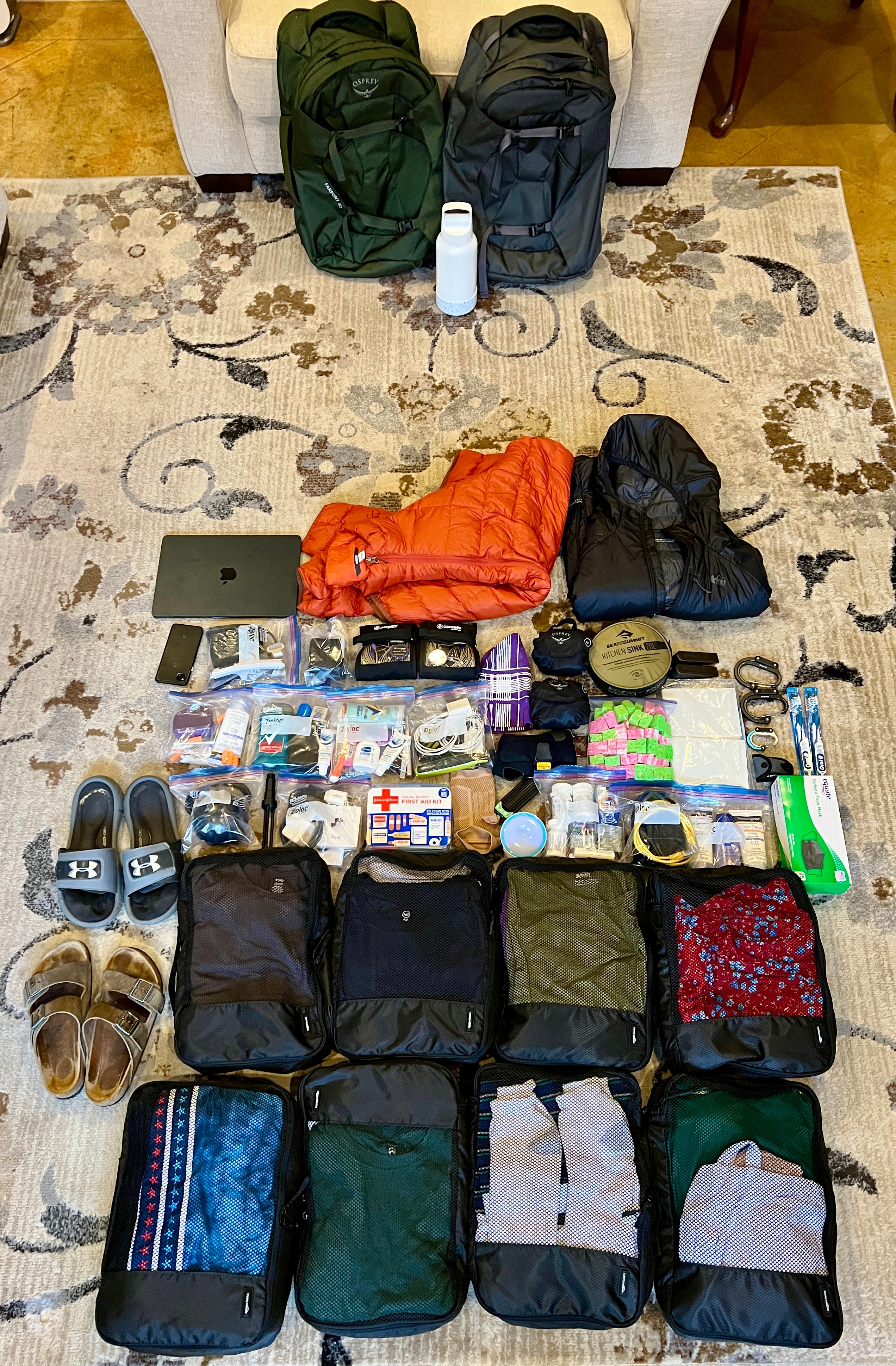 I’m sure by now you’re wondering how all of this stuff is going to fit neatly into two backpacks. It’s a simple answer - packing cubes and Ziploc bags! Both of these help provide much needed organization. Other than our jackets, all of our clothing items fit into the packing cubes. Everything else is in Ziploc bags which not only protect our tech items from weather but if any of the toiletries spill, the mess will be contained to the Ziploc bag. The cubes and Ziploc bags also make removing things easier without leaving everything else in a jumbled mess.